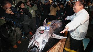 (النص الأصلي نُشر باللغة اليابانية، الترجمة من الإنكليزية. صورة الموضوع: الصحفيون يتجمعون حول سمكة إيتشيبان ماغورو التي وصل سعرها إلى 510 مليون ين ياباني وبجوارها الرئيس كيمورا كيوشي في فرع مطعمه الرئيسي سوشي زانمّاي في سوق تسوكيجي. © أ ف ب/ جيجي برس)