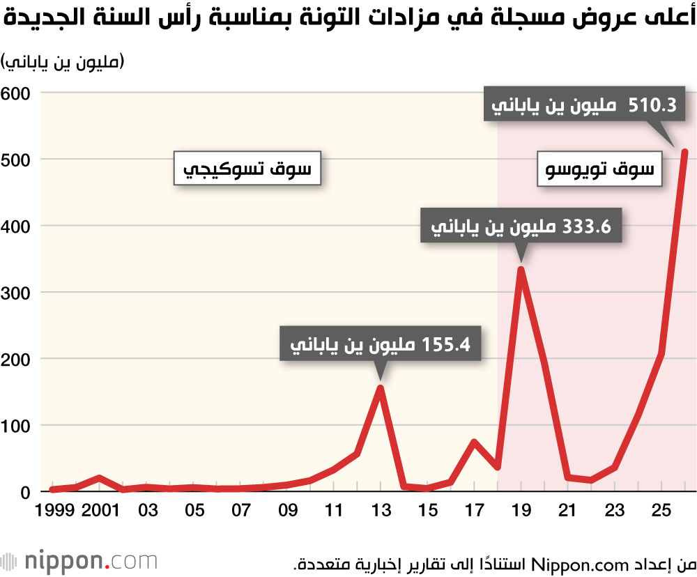 وفي عام 2019، عندما بلغت الأسعار 300 مليون ين، كان سوق طوكيو المركزي لتجارة الجملة قد انتقل لتوه من حي تسوكيجي إلى حي تويوسو، مما جعله أول مزاد رأس سنة يُقام في الموقع الجديد والذي شهد بدوره احتفالاً استثنائياً. وعند سعر 1.2 مليون ين للكيلوغرام، بدا من غير المرجح أن يتم تخطي السعر في أي وقت قريب. إلا أن هذا العام، وفي خضم ارتفاع الأسعار وزيادة الإنفاق السياحي الوافد، تم تجاوز هذا الرقم القياسي بشكل حاسم، مسجلاً رقماً قياسياً تاريخياً جديداً.
