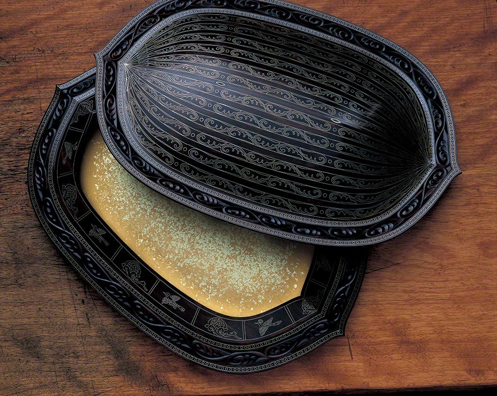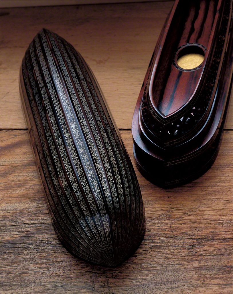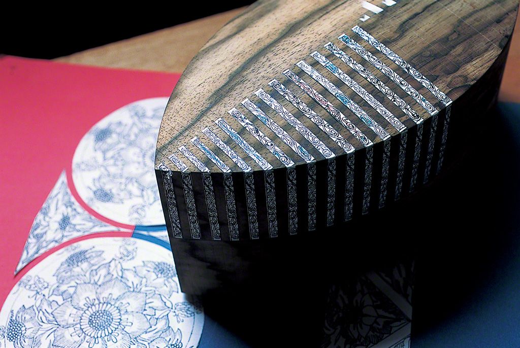 صندوق لأعواد البخور مرصع بـ’’رادين‘‘ والقصدير (٢٠١٠). يتم ترصيع القصدير وقشور متنوعة على سطح خشب البرسيمون الأسود. ولهذه القطعة الفنية بريق خادع يمكن أن يتغير بمهارة بناءا على زاوية نظر المشاهد.