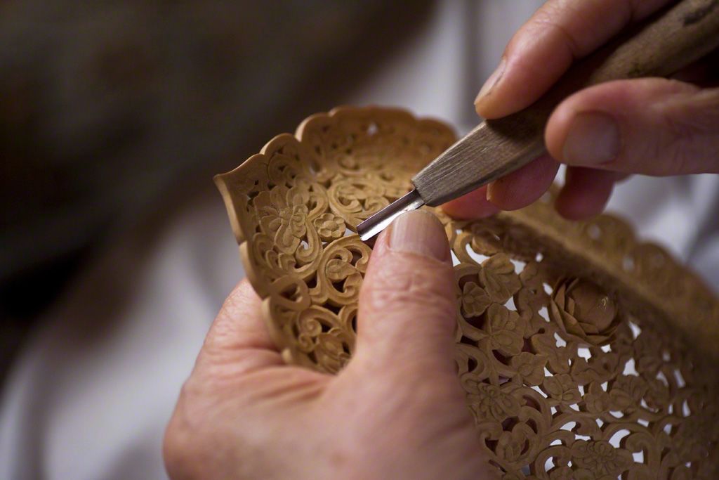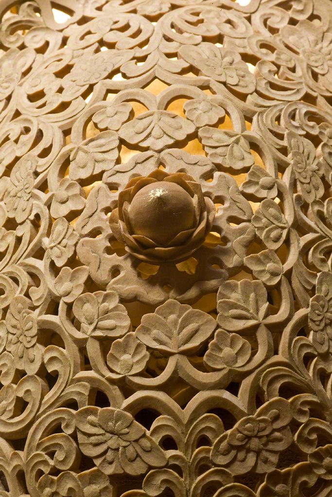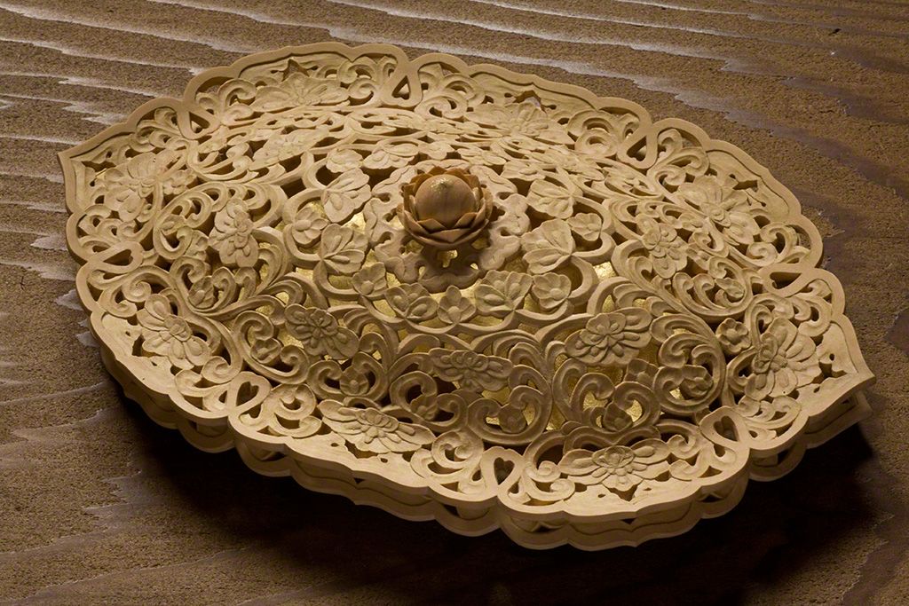 زخارف منقوشة على شكل أزهار اللوتس على الغطاء من قطع صغيرة من الخشب. وذلك مع لحظة تأمل في جمال التفاصيل تسلب الأنفاس.