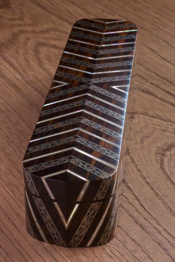 صندوق لفرشاة الكتابة مرصع بزخارف أزهار ملتوية (١٩٩٤). ترصيع بالقصدير على خشب البرسيمون الأسود.