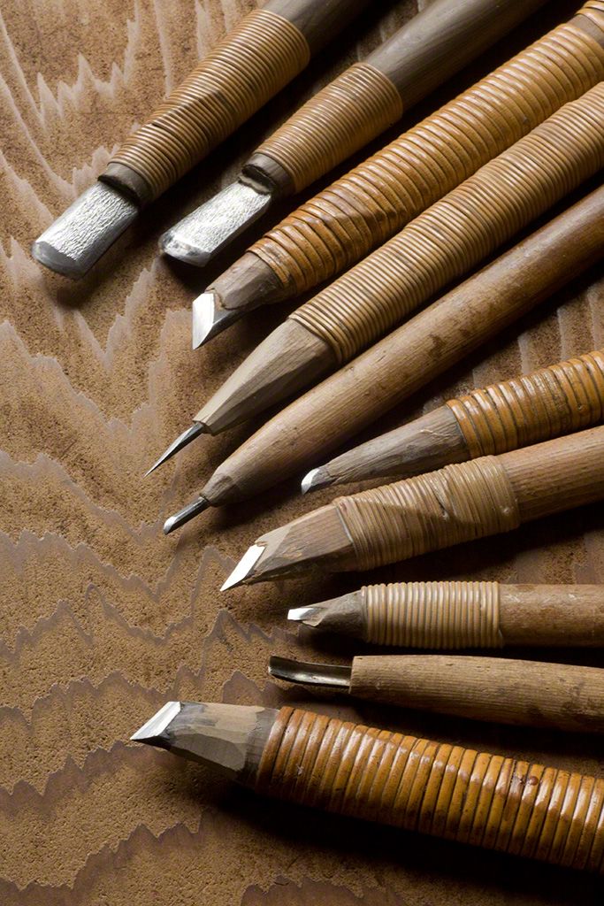 يستخدم أوساكا بعد نقش الشبكة أداة صغيرة لتنعيم الخشب وصَقله.
