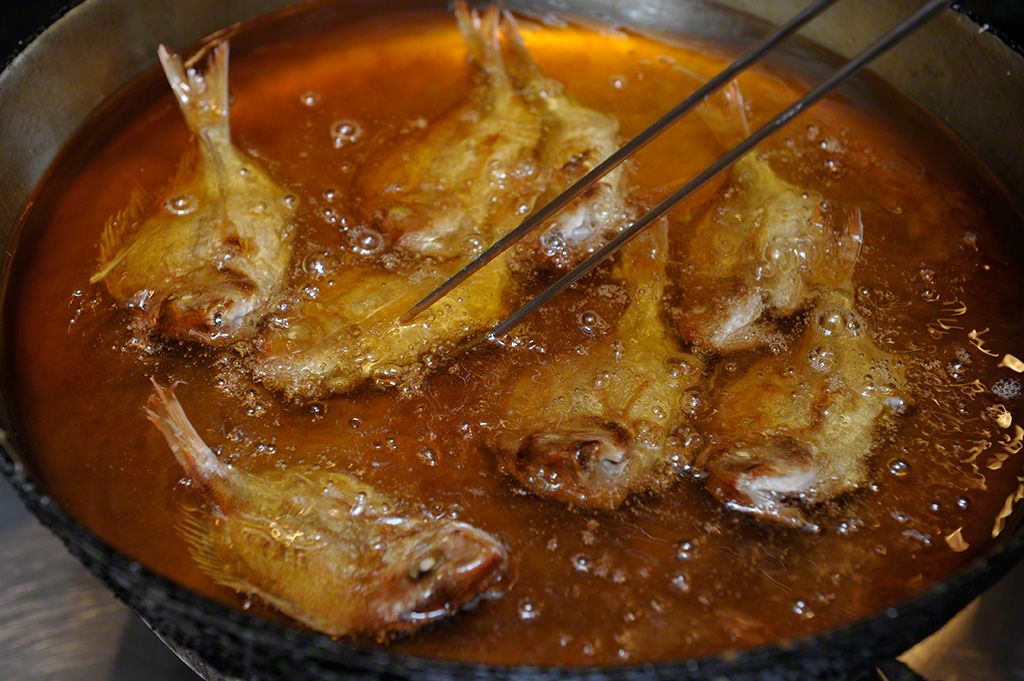 سمك الشبوط المقلي. السرعة خلال القلي أمر أساسي لتفادي القلي الزائد للسمك.
