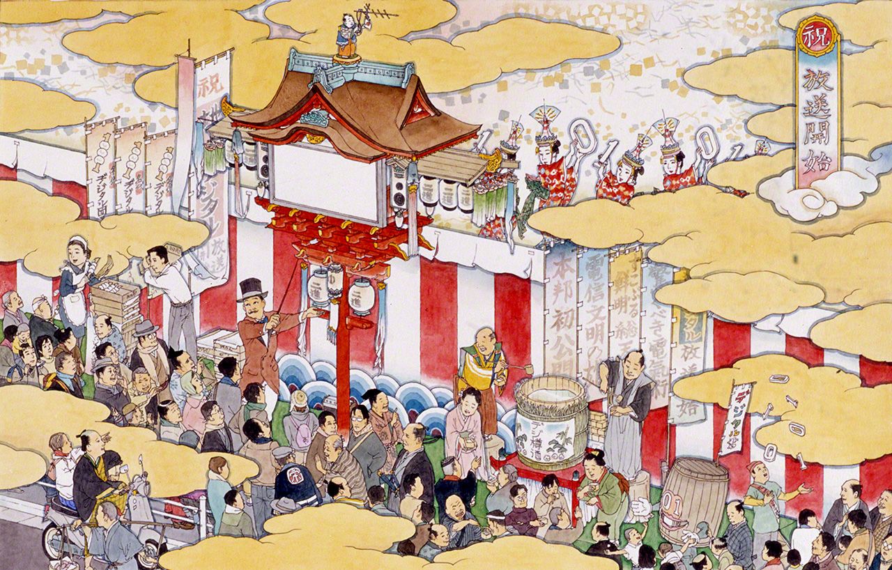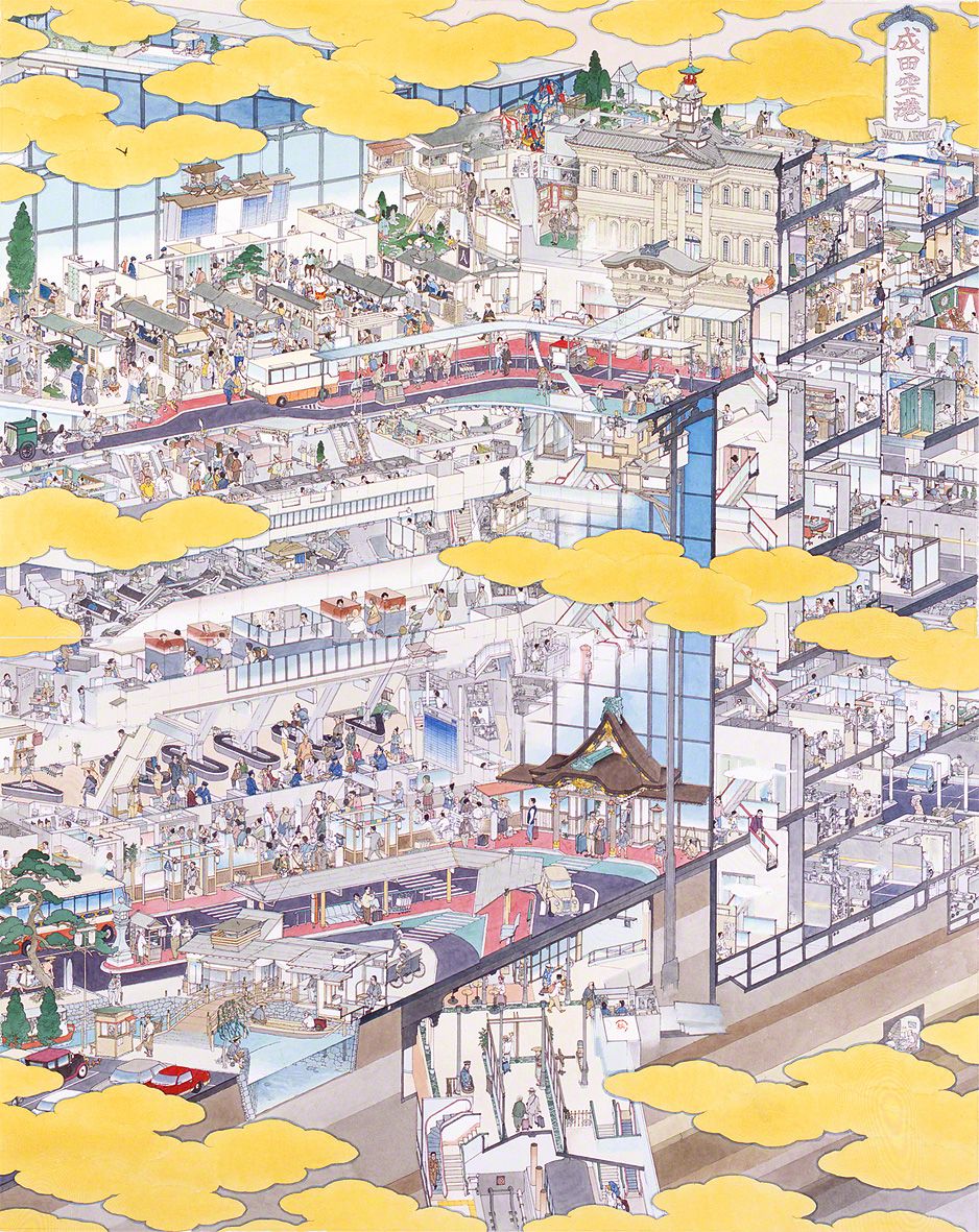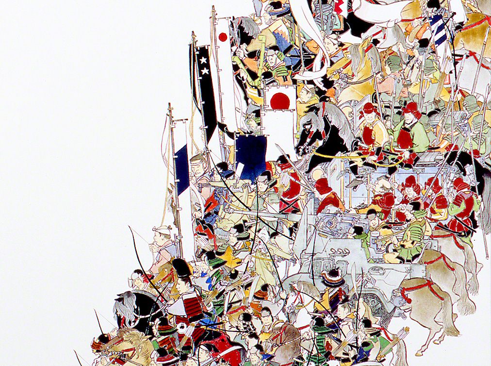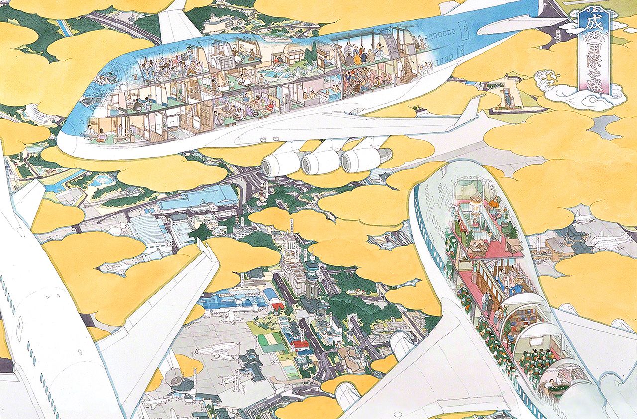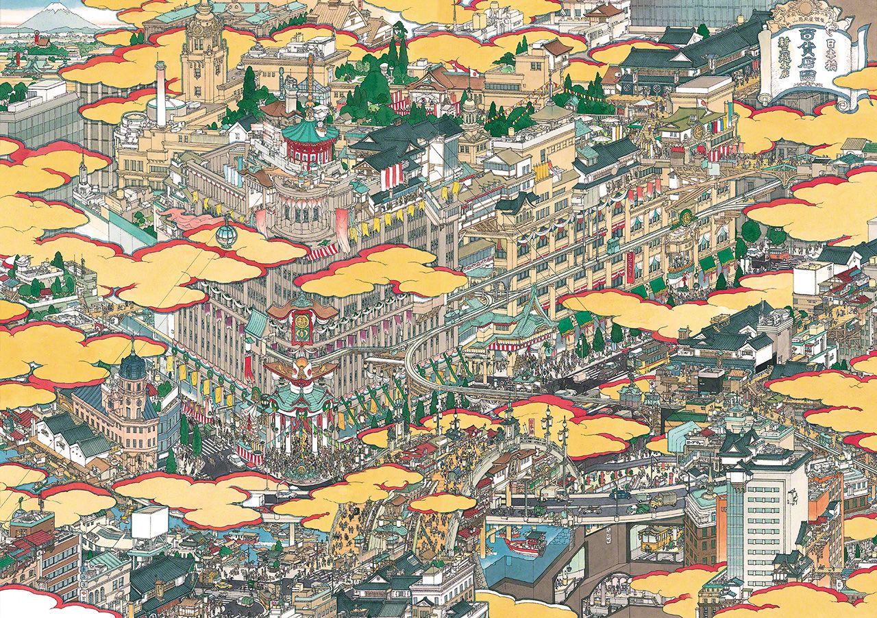 عند الوهلة الأولى يخيل لك أن هذه اللوحة اليابانية هي واحدة من اللوحات التقليدية ولكن إذا أمعنت النظر في تفاصيل هذه اللوحة بدقة ستلاحظ عالماً ساحراً اختلط فيه الماضي والحاضر والمستقبل. إنه عالم ساحر وخيالي منسوج بدقة متناهية يجذب إليه أعين ومخيلة الناظرة.