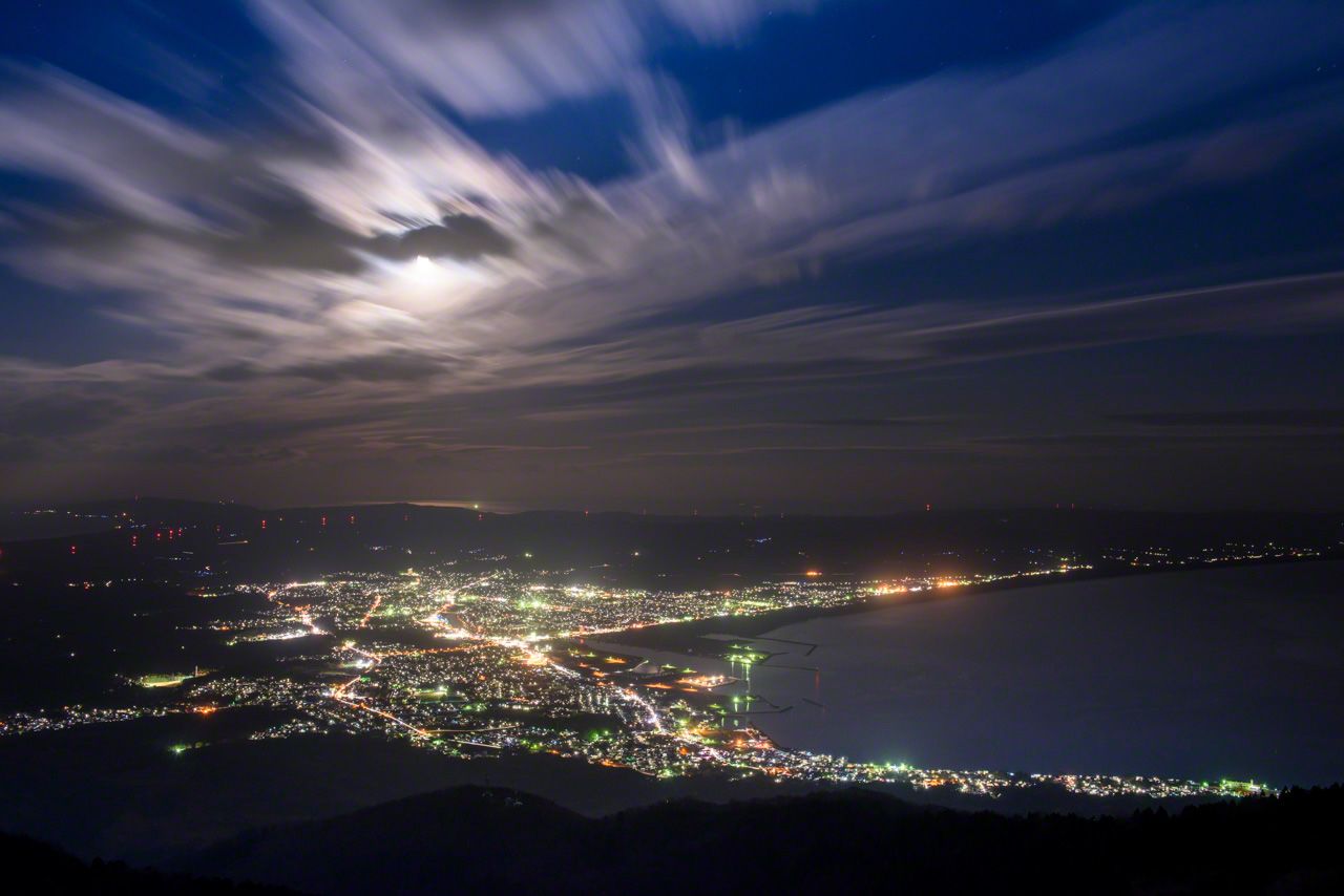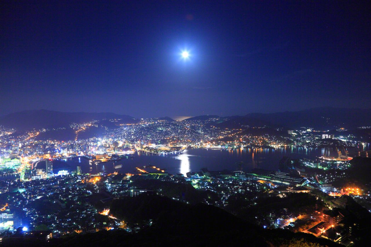 اكتمال القمر فوق ناغاساكي و”مسار“ ضوء القمر عبر الميناء ينظر إليه من سطح مراقبة إناساياما، محافظة ناغاساكي
