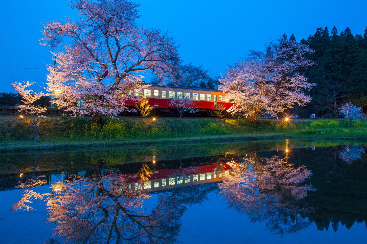 أزهار الكرز المضاءة في محطة إتابو على خط كوميناتو في محافظة تشيبا