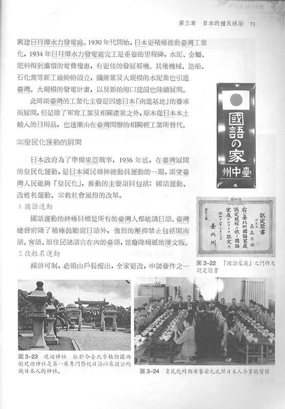 مقتطفات في كتب مدرسي للتاريخ في تايوان حول حركة نشر يابانية (قولا و فعلا) إبان فترة الاحتلال الياباني.