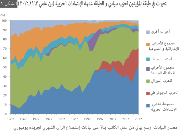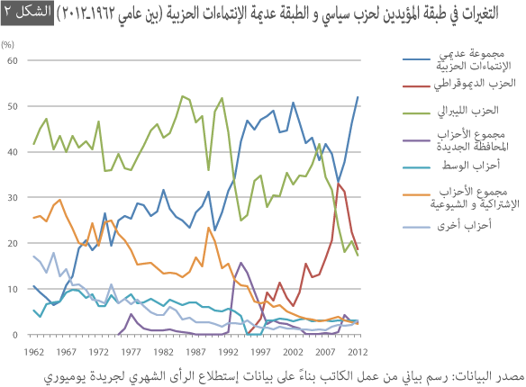 ومع حلول عام ٢٠١٢، زاد حجم الطبقة العديمة الإنتماءات الحزبية بشكل غير مسبوق ليصل إلى ٥٣٪ والسبب يرجع لإحباط اعترى كل من له الحق في التصويت من كافة الأحزاب السياسية، وبدأوا يرفضون تأييد أى حزب سياسي محدد. وبالتدقيق في الشكل ٢، في عام ٢٠٠٥، تجاوزت نسبة طبقة مؤيدي الحزب الليبرالي نسبة الطبقة عديمة الإنتماءات الحزبية كما تجاوزت نسبة طبقة مؤيدي الحزب الديمقراطي نسبة الطبقة عديمة الإنتماءات الحزبية في عام ٢٠٠٩، و لكن في الوقت الحالي تزيد الطبقة عديمة الإنتماءات الحزبية على مؤيدي الحزب الليبرالي ومؤيدي الحزب الديمقراطي مجتمعين.