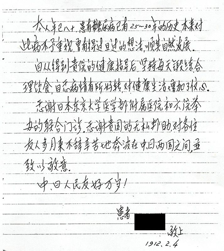 أنا في الثمانين من عمري. وقد عانيت من مرض السكري لمدة ٣٠ عام. في البداية، لم أكن أعتقد بأنه مشكلة كبيرة وتركت المرض ليأخذ مساره الطبيعي. ولكن من بين كل ما علمتوه لي، تعلمت المحافظة على نظام غذائي يومي وتعودت على ممارسة التمارين، شعرت بتحسنٍ في أعراضي واكتسبت الثقة لأعيش بأسلوب حياة صحي. أنا ممتن للتعاون بين اليابان والصين في مجال علاج المرضى، كما أكُنُّ احتراما كبيرا للأسلوب الذي كنتم جميعا تتبعونه بالسفر مرارا وتكرارا بين البلدين طوال أشهر دون أن تظهروا أي تعب.