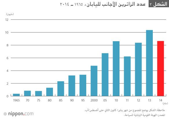 وقد جاءت الأرقام الأخيرة مشجعة ،حيث وصل عدد الزوار الأجانب لليابان عام ٢٠١٣ إلى ١٠.٣٦ مليون، لتتخطى بذلك حاجز الـ ١٠ ملايين سائح للمرة الأولى على الإطلاق (الشكل ٢). كما لعب انتعاش النمو الاقتصادي في البلدان المجاورة لليابان وانخفاض قيمة الين دورا في تلك الزيادة جنبا إلى جنب مع استمرار إطلاق حملة زيارة اليابان، التوسع في خدمات شركات الطيران، تخفيف شروط الحصول على التأشيرة للمسافرين من جنوب شرق آسيا. واستمر هذا الاتجاه خلال عام ٢٠١٤، مع زيادة سنوية بنسبة ٢٠٪ للفترة من يناير/ كانون الثاني حتى أغسطس/آب.