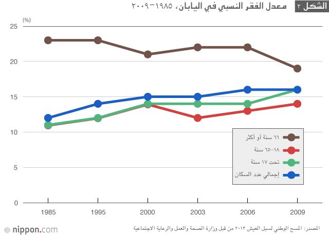الشكل ٢، الذي يرسم الاتجاهات في معدل الفقر النسبي في اليابان بين عامي ١٩٨٥ و٢٠٠٩، يكشف زيادة عموما وارتفاع حاد لا سيما بين اليابانيين الأصغر سنا. هذا يقوض حجة أولئك الذين يدعون أن ارتفاع مستويات الفقر في اليابان هي في المقام الأول ثمرة الشيخوخة الديموغرافية وحقيقة أن كبار السن عادة ما يكون لديهم دخل أقل.