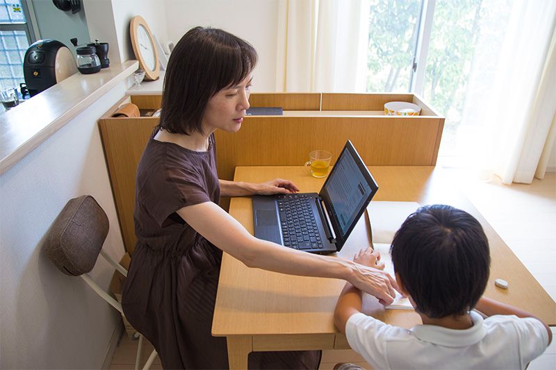 في أحد أيام شهر يوليو/ تموز، كانت تاكاغي كيوكو تجلس إلى مائدة الطعام أمام حاسوبها المحمول المستعار من مكان عملها. وكان ابنها البكر والذي دخل الصف الأول من المرحلة الابتدائية يلعب في غرفة المعيشة حيث أنه في الإجازة الصيفية. تحدثت تاكاغي قائلة: ”إن هذا النظام ساعدني للغاية، فليس هناك حاجة لإيداع طفلي في مكان ما أثناء العمل، أو حتى في أثناء العطلة المدرسية“.