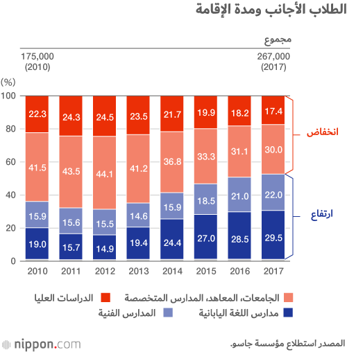 وتجدر الإشارة إلى أن مصطلح "الطلاب الأجانب" هو واسع النطاق ويندرج تحته طيف واسع من الطلاب الذين يتابعون دراستهم الدراسات العليا إلى أولئك الذين يدرسون بمدارس اللغة اليابانية. في عام 2010، قامت وزارة العدل في إطار خطتها الحالية بتوسيع نطاق تأشيرات الطلاب لتشمل الأشخاص الذين يدرسون في مدارس اللغة اليابانية. وفي وقت لاحق، انخفض عدد الطلاب الأجانب في الجامعات والمدارس العليا كنسبة مئوية ونسبة أعلى من الطلاب يترددون على الكليات التقنية أو مدارس اللغة اليابانية.