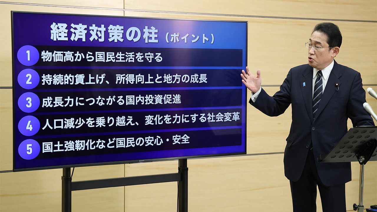 (النص الأصلي نُشر باللغة اليابانية، والترجمة من اللغة الإنكليزية. صورة الموضوع: رئيس الوزراء كيشيدا فوميؤ يشرح ركائز السياسات الاقتصادية الجديدة في 25 سبتمبر/ أيلول 2023، في مكتب رئيس الوزراء. البند الثاني هو الزيادة المستدامة للأجور. © جيجي برس)