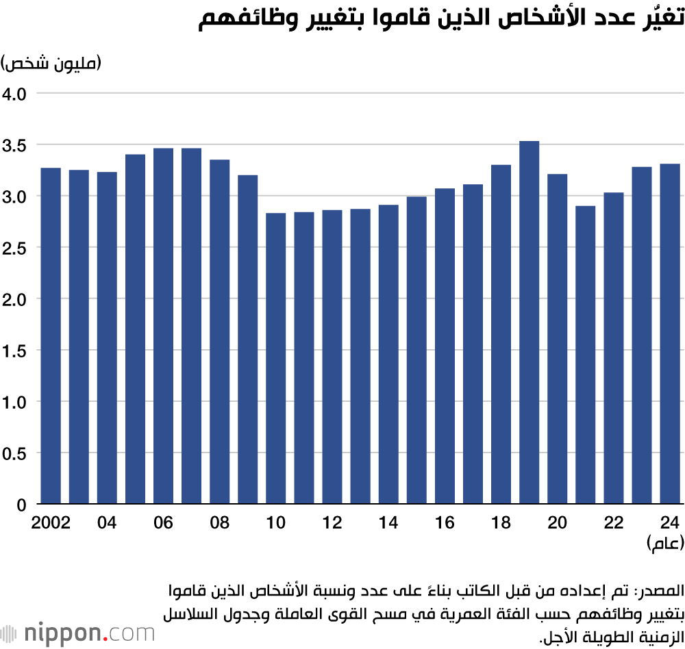 بالنظر إلى الرسم البياني الذي يبين تغيُّر عدد الأشخاص الذين قاموا بتغيير وظائفهم (الأشخاص العاملون الذين كانوا يشغلون وظائف سابقة وقاموا بتغييرها خلال العام السابق)، والذي تم إعداده استنادًا إلى مسح القوى العاملة، بلغ هذا العدد أقرب ذروة له مؤخرًا في عام 2019 ليصل إلى 3.53 مليون شخص. وبعد ذلك، انخفض هذا العدد مرة أخرى بسبب تأثير جائحة كورونا، ووصل إلى أدنى مستوياته في عام 2021، ثم بدأ في الزيادة في عام 2022، واستمر في الزيادة منذ ذلك الحين. وكما تمت ملاحظة انخفاض في عدد الأشخاص الذين قاموا بتغيير وظائفهم خلال فترة الأزمة المالية العالمية بين عامي 2008 و2009، مما يؤكد أن القيام بتغيير العمل يتأثر بالحالة الاقتصادية.