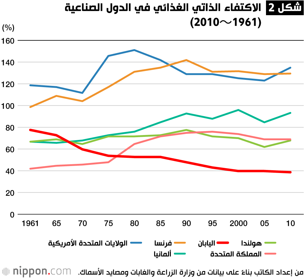 ويوضح الشكل 2 التحول في مقدار الاكتفاء الذاتي الغذائي بين البلدان الصناعية الرئيسية. وللأسف، كانت نسبة اليابان تنخفض باستمرار. ومنذ ستينيات القرن العشرين، شهدت بلدان صناعية أخرى استقرارًا أو نموًا حقيقيًا في الاكتفاء الذاتي من الغذاء، في حين كانت نتائج سياسات التصنيع الأحادية التفكير في اليابان واضحة جلية.