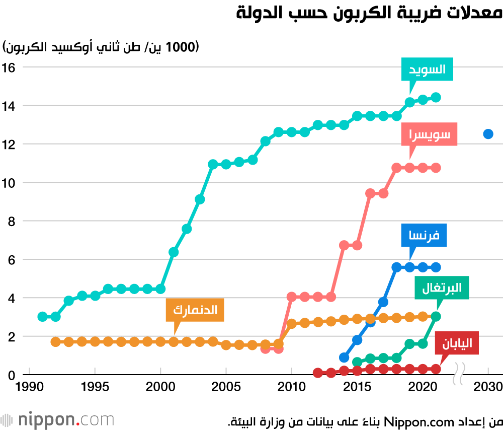 وعلى النقيض من ذلك، تُفرض ضريبة الإجراءات المضادة للاحترار العالمي في اليابان، والتي تم تبنيها في عام 2012، في المنبع على الوقود الأحفوري بمعدل منخفض للغاية يبلغ 298 ينًا لكل طن من ثاني أكسيد الكربون، مع عدم وجود زيادات مقررة. وبالمقارنة مع مخططات تسعير الكربون في أوروبا، فهو نصف مقياس مع تأثير ضئيل على خيارات الطاقة في البلاد.