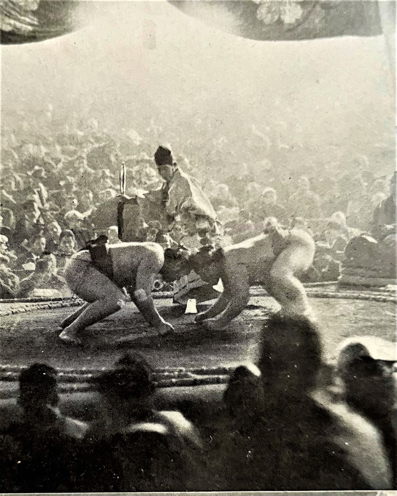 تلامس الجباه أثناء الاشتباك بين تامانيشيكي (على اليمين) وميسوغيئسو في إحدى بطولات السومو في يناير/ كانون الثاني 1926.