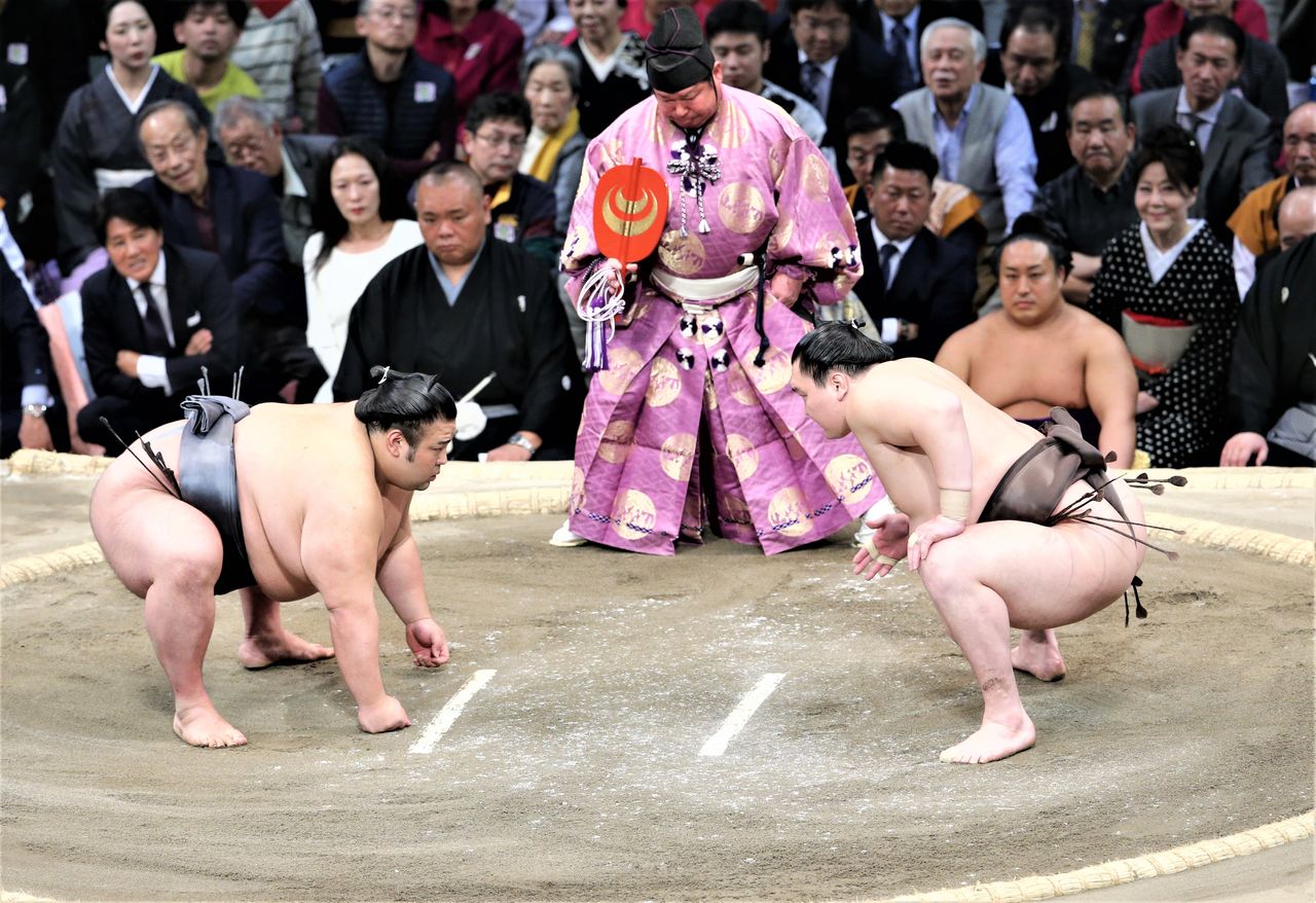 يجلس كلا المصارعين بكامل تركيزهما في وضع القرفصاء العميق ويضعا قبضتيهما بإحكام على الـ دوهيو. كانت ”المواجهات“ بين تاكانوهانا و أكيبونو دائمًا ما تبعث على الهيبة والتوتر. (© جيجي برس)