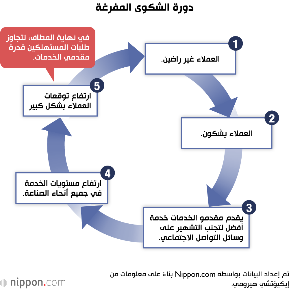 تُعد ثقافة الخدمة في اليابان، المستمدة من روح الضيافة التقليدية (أوموتيناشي) والتي تتميز بمستويات عالية من الجودة، عاملاً رئيسياً في تحقيق رضا العملاء. لكن في الوقت نفسه، قد تكون السبب في تضخم الشكاوى. يمكن تفسير هذه الظاهرة من خلال الآلية التالية، المتأثرة ببيئة الوسائط المتغيرة: