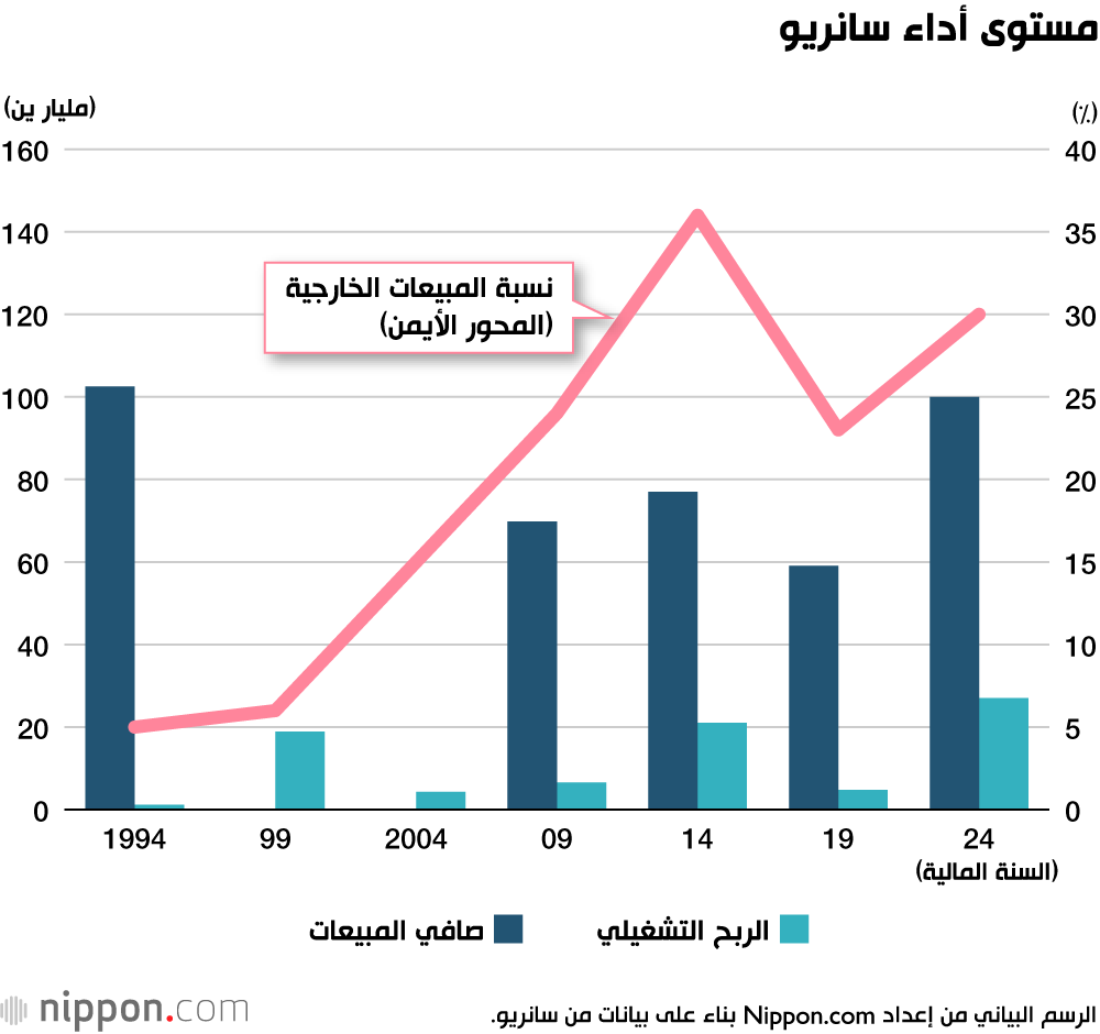 لدى شركة سانريو اليوم نشاطا في أكثر من 130 دولة ومنطقة. في السنة المالية التي انتهت في مارس/آذار عام 2004، تجاوزت مبيعاتها الخارجية 10 مليارات ين، ولكن بعد عقد من الزمان ارتفع هذا الرقم إلى أكثر من 30 مليار ين.
