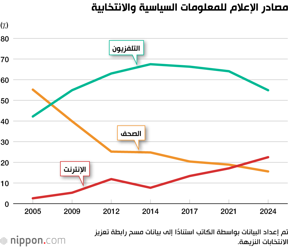 في المقابل، تشهد اليابان تحولات أكثر بطئًا، ولكنها عميقة التأثير على المدى الطويل، تتعلق بتغير أنماط استهلاك المعلومات السياسيّة بين الأجيال. إذ أظهر استطلاع جمعية تعزيز الانتخابات العادلة (APFE) لعام 2024 أن الفئات الأكبر سنًا ما زالت تعتمد على الصحف كمصدرها الرئيس، في حين يُفضل الناخبون في منتصف العمر التلفزيون، بينما يتجه الشباب بشكل متزايد نحو الإنترنت ووسائل التواصل الاجتماعي للحصول على المعلومات السياسية. هذا التحول الجيلي في أدوات التلقي والتفاعل يشير إلى أن التأثير السياسي للإنترنت سيزداد مع مرور الوقت.