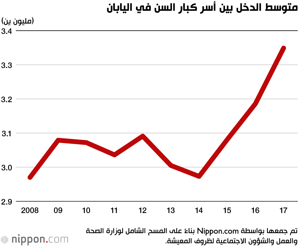 سجل متوسط الدخل السنوي للأسر رقما قياسيا جديدا قدره 3.349 مليون ين في عام 2017، وهو ما يمثل الزيادة السنوية الثالثة على التوالي. أكثر من نصف الدخل، أو ما يمثل 61.1٪ يأتي من مدفوعات المعاشات التقاعدية. وفي الوقت نفسه، هناك 25.4٪ من الأجور عن طريق الوظيفة الحالية، مما يدل على عدد كبار السن في اليابان يواصلون العمل بعد التقاعد لمساعدة أنفسهم في تحمل أعباء الحياة بعد التقاعد. لم يشمل المسح الأموال التي تم الحصول عليها المتقاعدون من مدخراتهم، مثل استحقاقات التقاعد الإجمالية. من بين الذين شملهم الاستطلاع في عام 2018، وصف 55.1٪ ظروفهم المعيشية بأنها "صعبة"، بزيادة قدرها 54.2٪ من العام السابق.