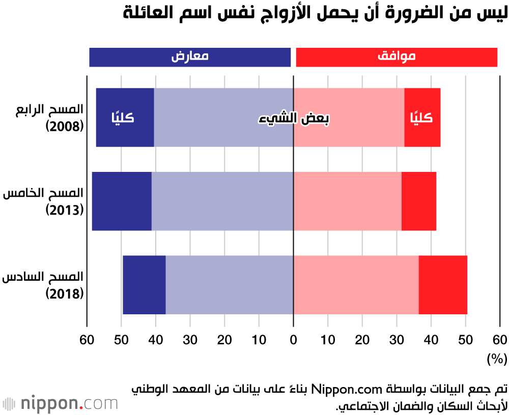 يجري المعهد الوطني لبحوث السكان والضمان الاجتماعي دراسة استقصائية وطنية عن التغييرات الأسرية كل خمس سنوات. لأول مرة في عام 2018، وافق أكثر من 50% من المجيبين أنه من الجيد للأزواج أن يكون لديهم ألقاب مختلفة.
