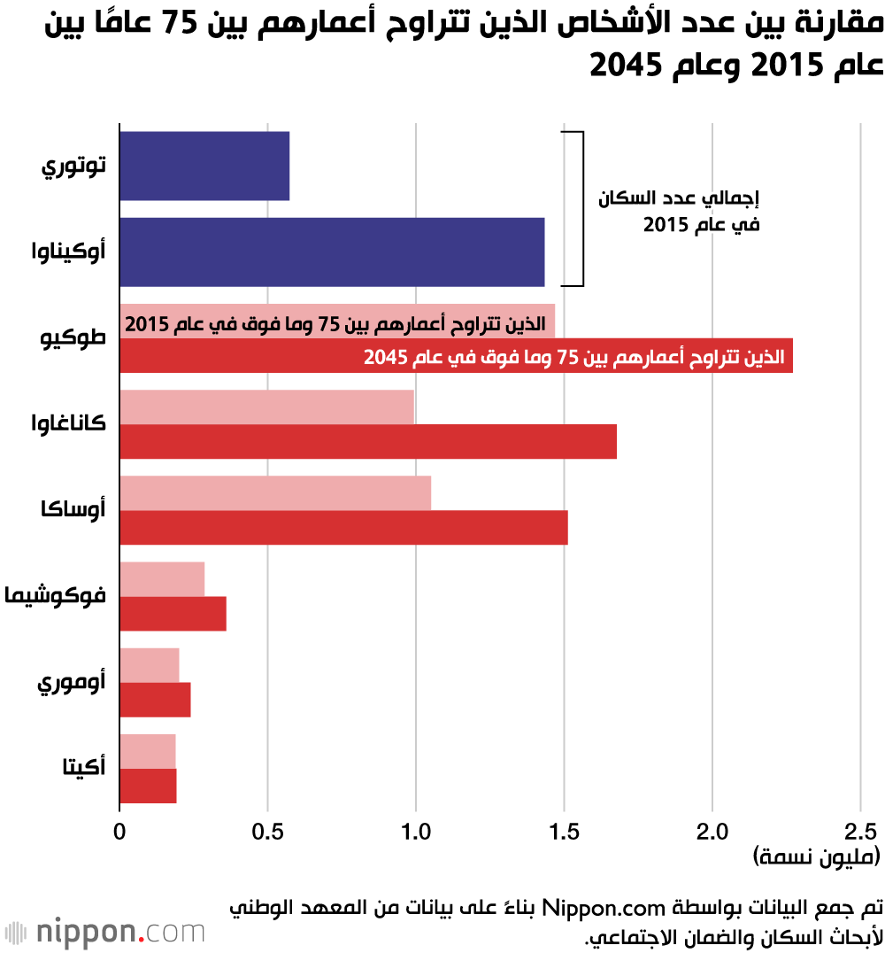 والحقيقة هي أن إجمالي عدد السكان ومعدل الزيادة لدى كبار السن الذين تزيد أعمارهم عن 75 عامًا أعلى في المدن منه في المناطق الريفية. مقارنةً بعام 2015، من المتوقع أن يزداد عدد السكان المسنين في المحافظات ذات المدن الكبيرة، وخاصة طوكيو وأوساكا.