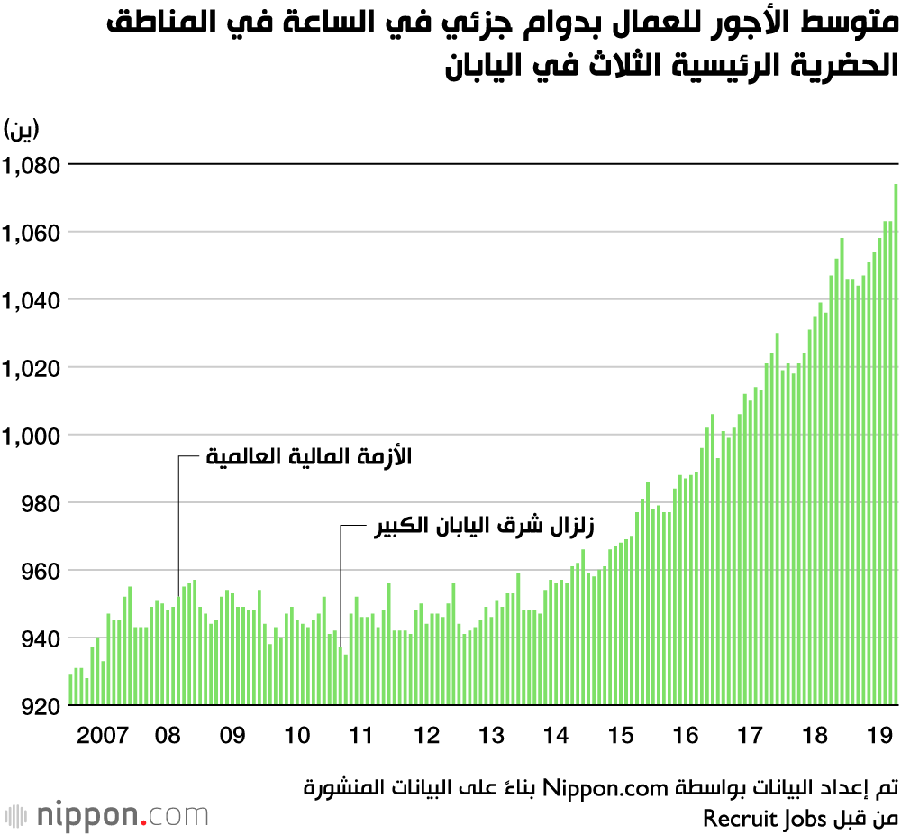 توصلت دراسة استقصائية أجرتها شركة التوظيف اليابانية Recruit Jobs حتى أكتوبر/ تشرين الأول 2019، أن متوسط الأجور لمن يعملون بدوام جزئي المقدم للباحثين عن عمل في المناطق الحضرية الرئيسية الثلاث في اليابان (المتمركز في طوكيو، ناغويا، وأوساكا) هو 1074 ين في الساعة، وهو رقما قياسيا.