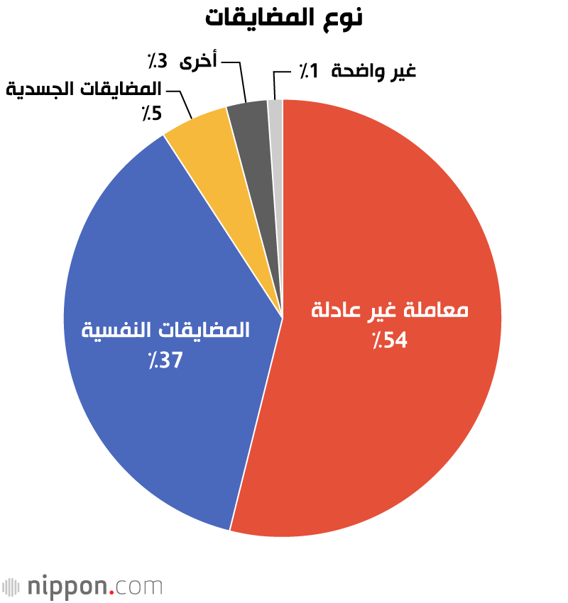 تم تصنيف "المعاملة غير العادلة"، مثل الفصل من الوظيفة أو تخفيض الدرجة الوظيفية، كأكثر أشكال التمييز شيوعًا بين النساء اللاتي استشرن المنظمة، بنسبة 54٪، على إنها تلاها حالات "المضايقات النفسية" بنسبة 37٪، والتي تأخذ أشكالًا شملت الإساءة اللفظية وتعليقات مرفوضة من المشرفين أو زملاء العمل. ووجد أن حوالي 5٪ من المشكلات تندرج تحت فئة "المضايقات الجسدية" لأن النساء عانين من نوع من المشاكل العضوية نتيجة للضغط الذي يتعرضن له. وتشمل حالات خطيرة مثل اضطراب ما بعد الصدمة الناتج عن الإجهاد اللاحق للصدمات الناتجة عن الإساءات اللفظية، والاكتئاب الذي يعانين منه بسبب تعرضهن للإجبار على ترك العمل، وكذلك النساء اللاتي عانين من الإجهاض نتيجة تعرضهن للضغوط