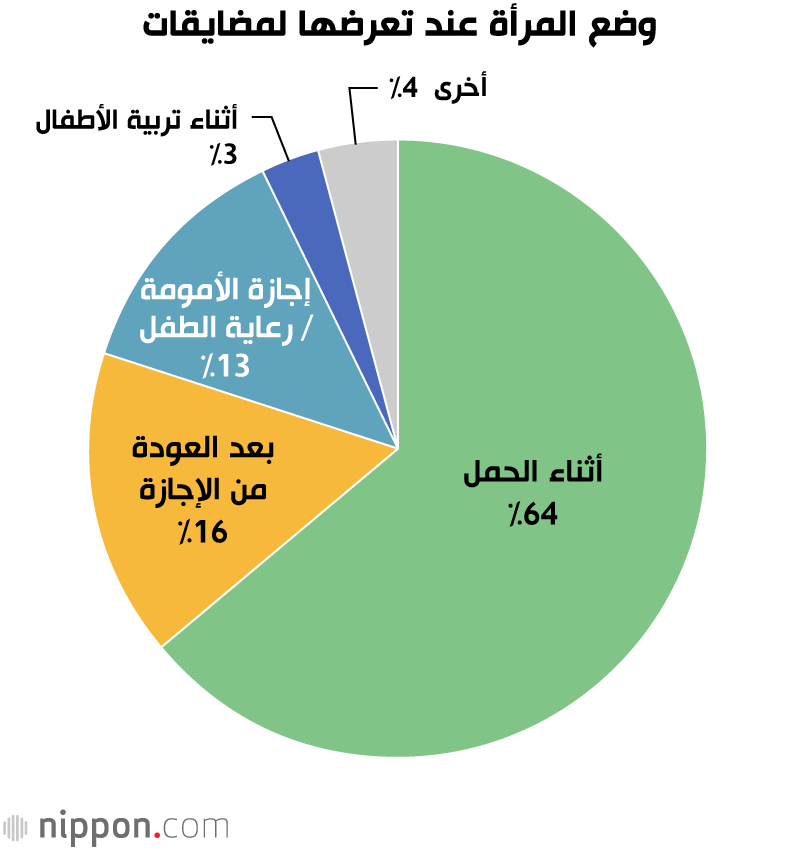 من بين ضحايا المضايقات، كانت الغالبية البالغة 64٪ من النساء الحوامل، تليها 16٪ ممن عدن إلى مكان العمل بعد الولادة، و 13٪ كن في إجازة أمومة أو رعاية الطفل. واتخذ النوع الأكثر شيوعًا من المضايقات التي تستهدف النساء الحوامل شكل اقتراحات بأن عليهن ترك عملهن أو توجيه تهديدات بالفصل أو إنهاء العقد. أما بالنسبة للنساء اللائي لديهن إجازة أمومة أو رعاية الطفل، كانت الأشكال المميزة للمضايقات تتمثل في الحث على عدم العودة إلى الوظيفة من خلال تعليقات مثل "لا يوجد مكان لك" أو "لا يوجد مكان لك للعودة إليه" - وتخفيض ظروف ومزايا عملهن قبل عودتهن. وبالنسبة إلى النساء اللاتي عدن إلى العمل بعد الولادة، فإن المضايقات الأكثر شيوعًا تندرج تحت فئة "المعاملة غير العادلة"، مثل تخفيض الرواتب أو تخفيض الدرجة الوظيفية، أو تغييرات وتقلبات عدة في محتوى واجبات وظيفتهن، أو إجبارهن على عقد عمل غير نظامي.