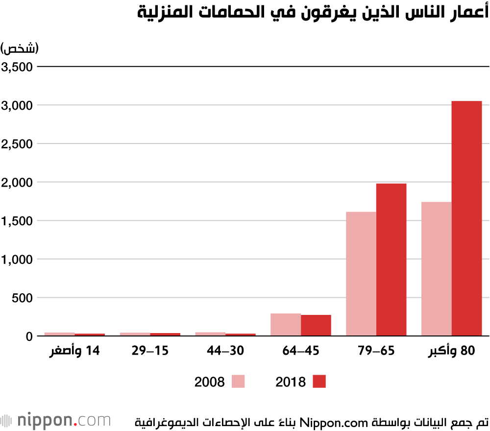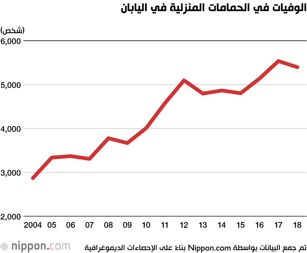 في عام 2018 في اليابان، غرق 5،398 شخصًا في أحواض الاستحمام المنزلية، وفقًا للإحصاءات الديموغرافية الصادرة عن وزارة الصحة والعمل والشؤون الاجتماعية. والنتيجة هي أقل من 138 حالة وفاة عن العام السابق ولكن 260 أكثر مما كانت عليه في عام 2016. والمجموع هو ما يقرب من ضعف الرقم لعام 2004 الذي كان 2870 حالة، وبقي في نطاق ما يقرب من 5000 حالة وفاة سنوية لعدة سنوات.