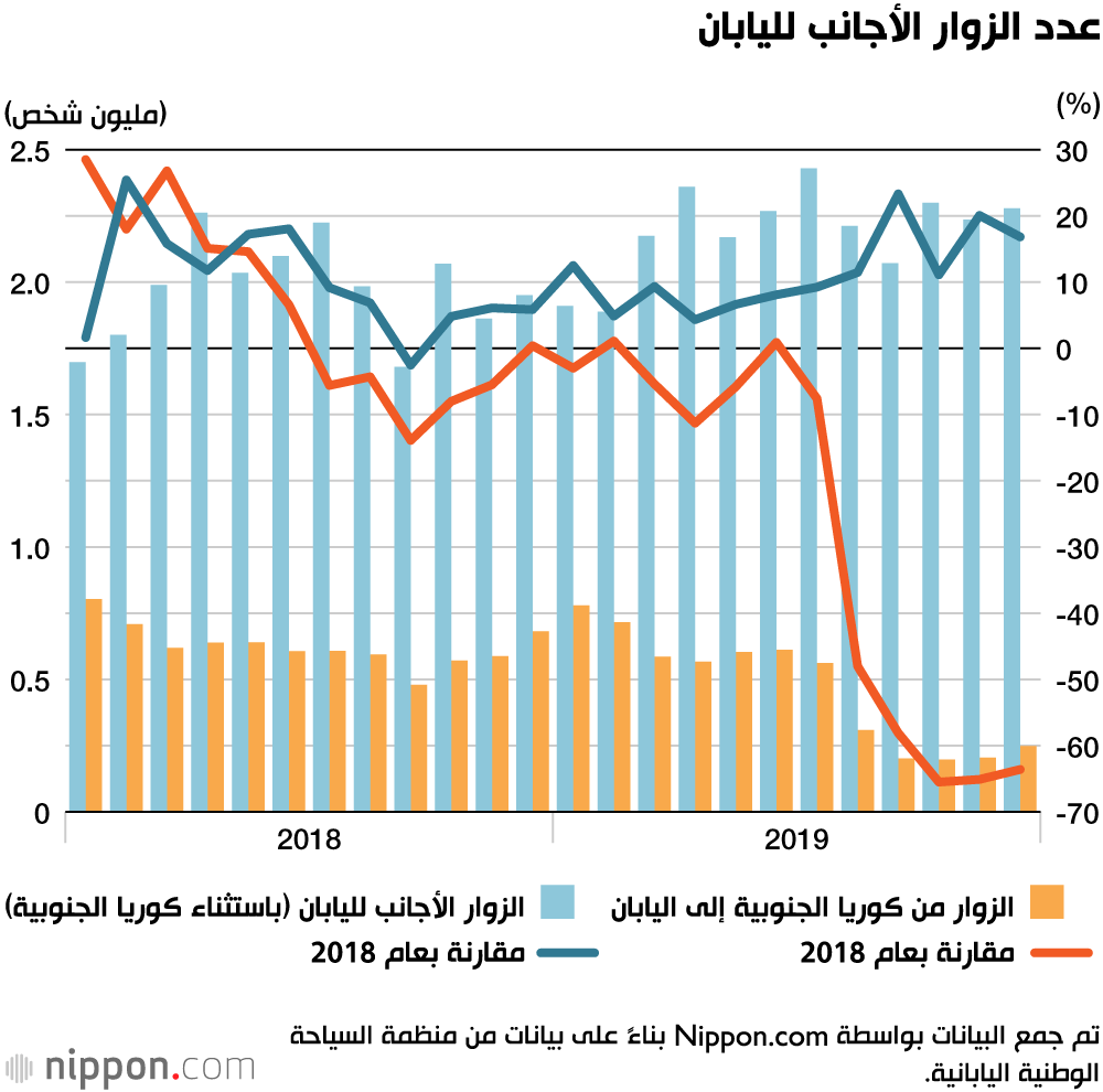 في عام 2019، كان هناك 5.6 مليون زائر من كوريا الجنوبية لليابان، أي أقل بنسبة 25.9٪ من الذروة حين وصل عدد الزوار الكوريين الجنوبيين إلى 7.5 مليون في عام 2018، عندما كانوا يشكلون ربع المجموع الكلي. واصلت أعداد الزوار إلى اليابان من الدول الأخرى في الزيادة، حيث ارتفع عدد السياح من الصين بنسبة 14.5٪ في عام 2018 ليصل إلى 9.6 مليون، ومن المحتمل أن يتجاوز 10 ملايين زائر.