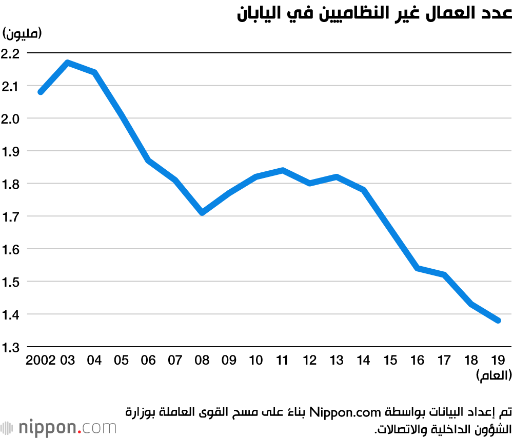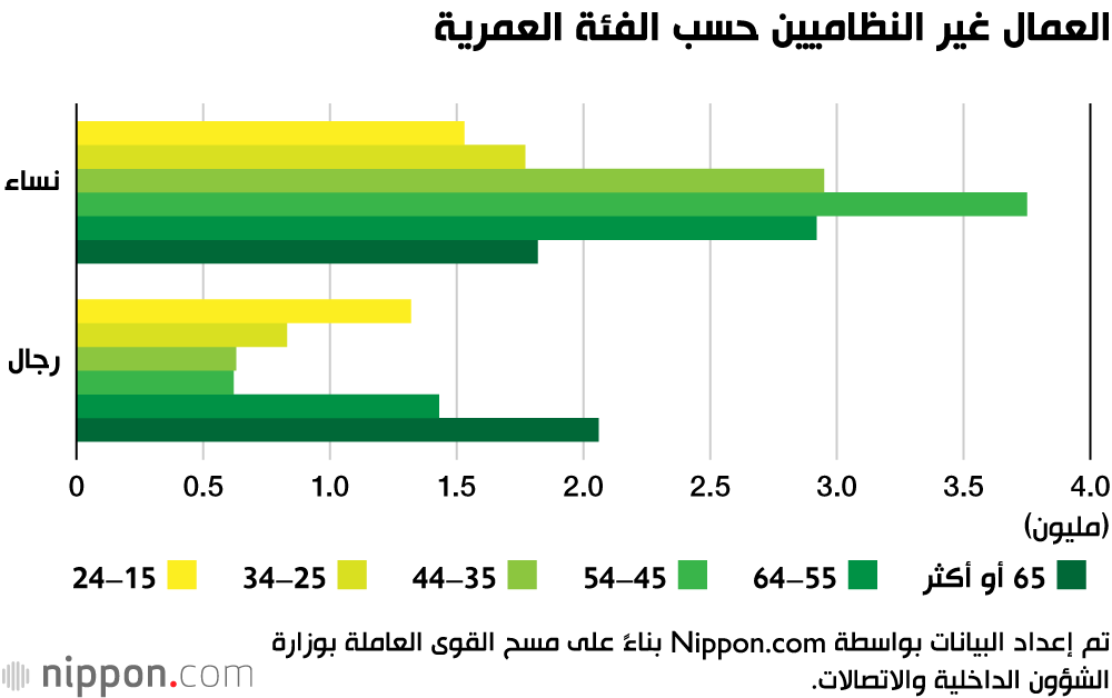انخفض عدد الشباب الياباني الذين يعملون في وظائف بصورة غير منتظمة بسبب سوق العمل المواتية في اليابان. وفي الوقت نفسه، يعمل عدد متزايد من كبار السن في هذه الأنواع من الوظائف.