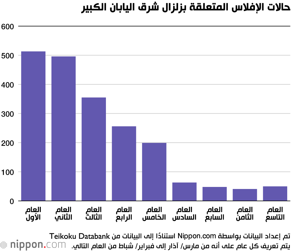 في السنوات التسع التي تلت زلزال شرق اليابان الكبير، حدثت 2021 حالة إفلاس مرتبطة بالكارثة، مع خسائر بلغت 1.70 تريليون ين. في السنة التاسعة (مارس/ آذار 2019 إلى فبراير/ شباط 2020)، كان هناك 50 حالة إفلاس. في حين أن هذه هي عُشر الحالات الـ 500 التي حدثت في السنة الأولى، إلا أنها الزيادة الأولى على أساس سنوي.