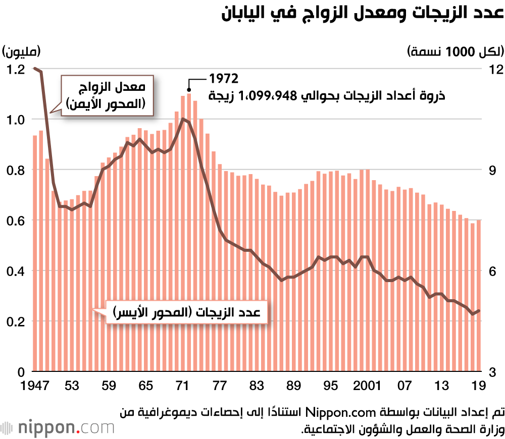 في عام 2019، كانت هناك 598.965 زيجة في اليابان وفقًا للإحصاءات الصادرة عن وزارة الصحة والعمل والشؤون الاجتماعية، بزيادة تقدر بأكثر من 12 ألف زيجة مقارنةً بعام 2018. وكان عدد الزيجات قد بدأ في الانخفاض في اليابان بعد أن بلغ ذروته في عام 1972 بـ 1.1 مليون زيجة. على الرغم من حدوث ارتفاع مؤقت في التسعينات، إلا أن الرقم بدأ في الانخفاض مرة أخرى في الألفية الجديدة. لكن في عام 2019، ازداد عدد الزيجات عامًا بعد عام لأول مرة منذ سبع سنوات، على ما يبدو نتيجة لبداية عصر ريوا الذي اعتبره العديد من الأزواج وقتًا ميمونًا للزواج.