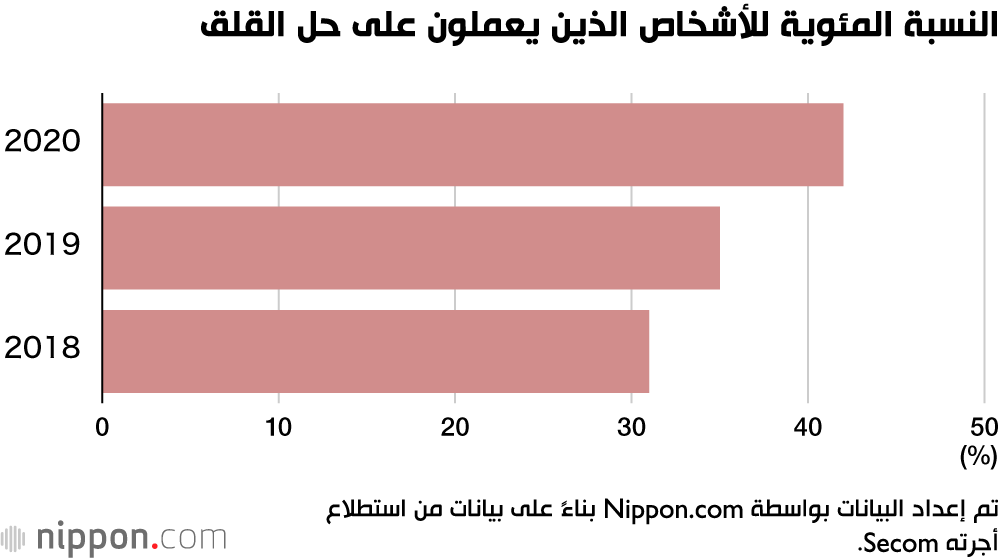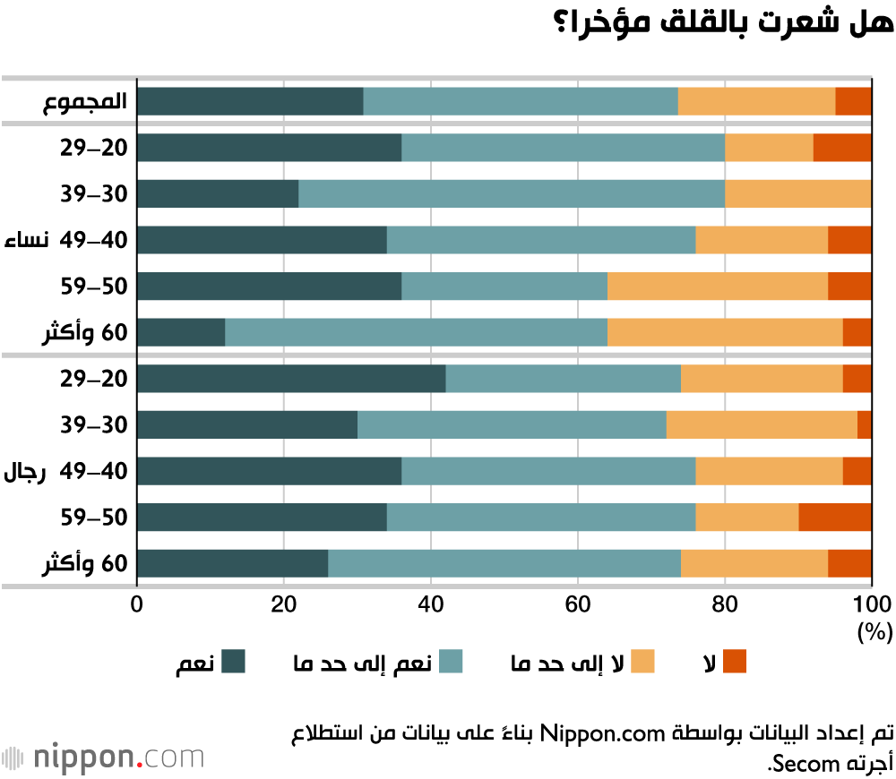 في استطلاع رأي أجري في يونيو/ حزيران 2020 بشأن القلق بين اليابانيين، قال أكثر من 70٪ من المشاركين أنهم شعروا بدرجة من القلق بشأن شيء ما مؤخرًا. على وجه الخصوص، أشارت 80٪ من النساء في العشرينات والثلاثينات من العمر إلى أنهن عانين من القلق، وهو أعلى رقم في أي فئة سكانية. وكانت أدنى مرتبة للنساء في الخمسينات من العمر، والبالغات من العمر 60 عامًا فأكثر، بنسبة 64٪.