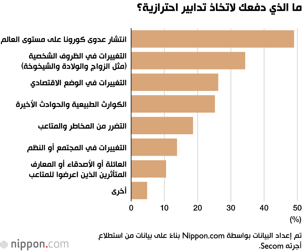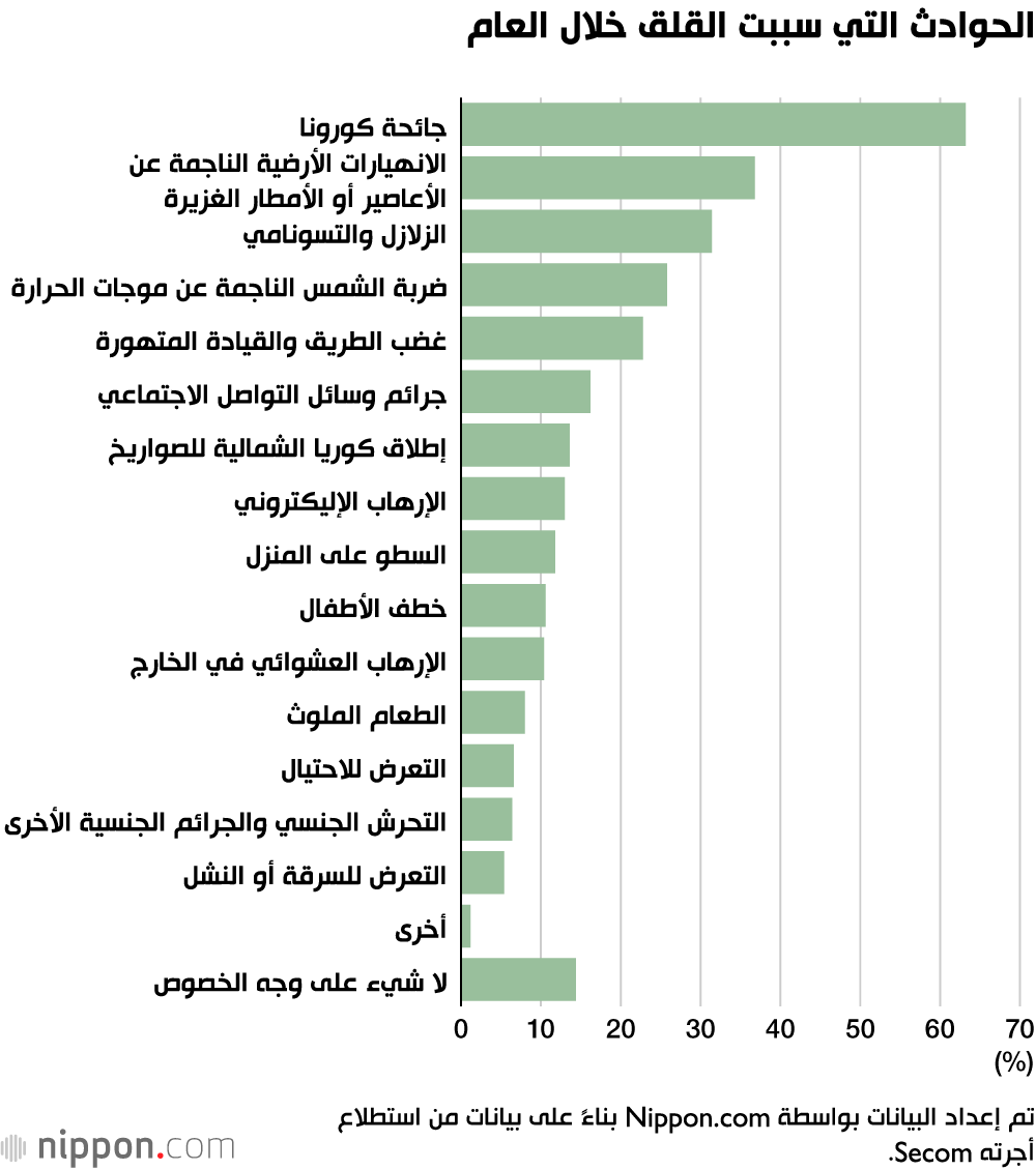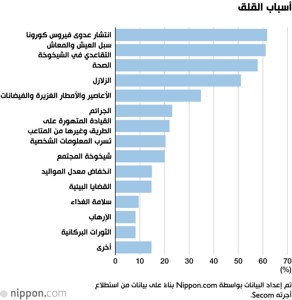 كان تأثير جائحة كورونا على المجتمع والاقتصاد واضحًا حيث كانت القضية الأكثر إثارة للقلق في مسح هذا العام هي ”انتشار الأمراض المعدية“ (61.7٪). وقد احتلت المرتبة أعلى بقليل من ”سبل العيش والمعاش التقاعدي في الشيخوخة“ (61.1٪)، وهو ما تسبب في معظم القلق في السنوات الثماني الأولى بعد أن بدأت شركة الأمن Secom المسح السنوي في عام 2012.