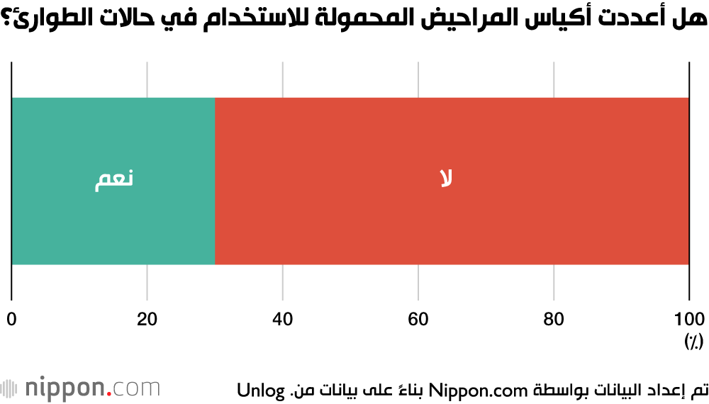 في أسوأ السيناريوهات، يُعتقد أن ما يصل إلى 70٪ من الناس يمكن أن يكونوا محرومين من الوصول إلى المراحيض خلال الوقت اللازم لتأكيد سلامة نظام الصرف الصحي نظرًا لوجود حد لعدد الأشخاص الذين سيكونون قادرين على استخدام المراحيض في ملاجئ الطوارئ. تم إجراء الاستطلاع بواسطةUnlog ، وهي شركة مقرها طوكيو تقدم تطبيق خاص بصحة حركة الأمعاء.