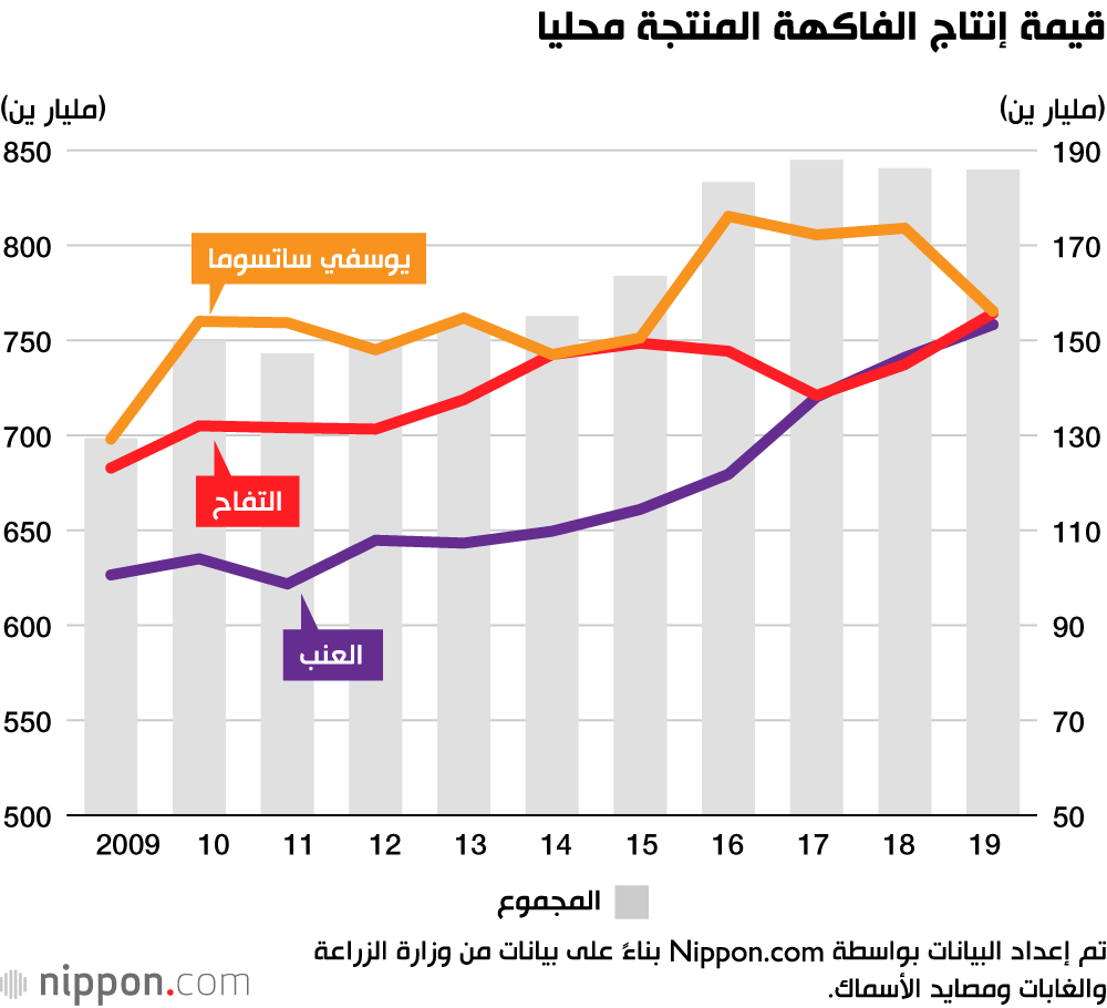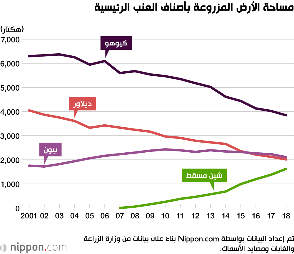 في حين أن إنتاج الفاكهة بشكل عام في انخفاض، فإن إنتاج العنب يزدهر. عامًا بعد عام، كانت الفجوة مع اليوسفي والتفاح تتضاءل، وفي عام 2018، ارتفع العنب إلى المركز الثاني، خلف اليوسفي. بدعم من صنف شين مسقط، قد يستمر أداء العنب في التقدم بشكل قوي في الأسواق اليابانية.
