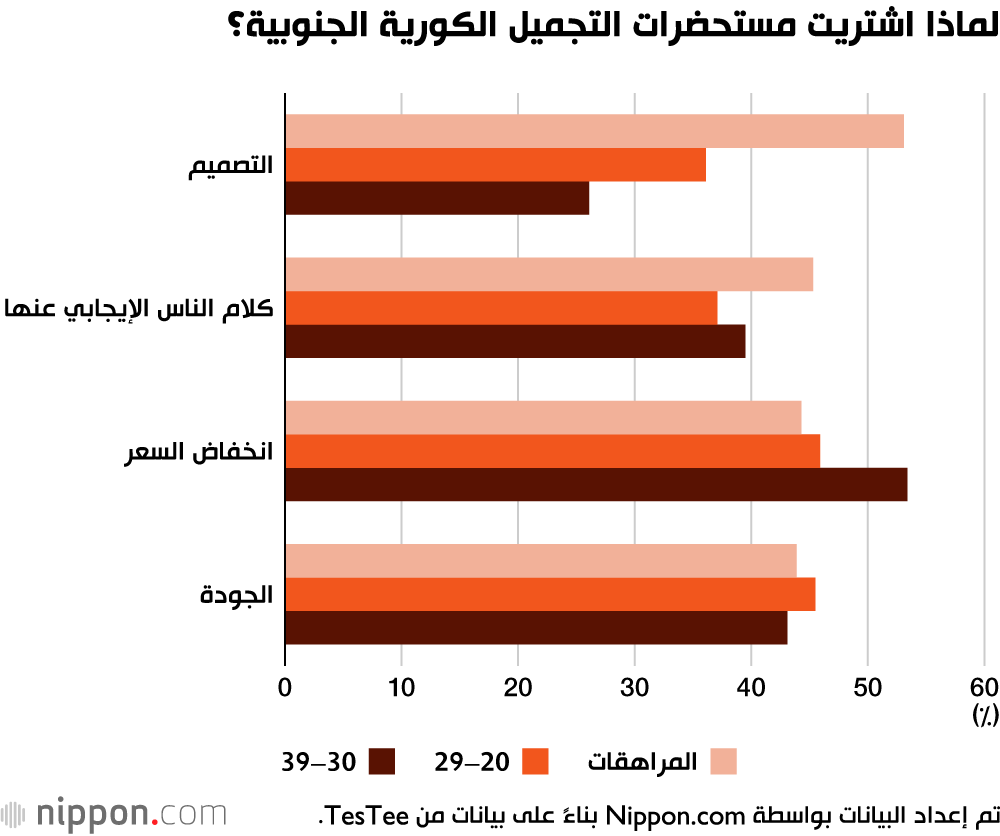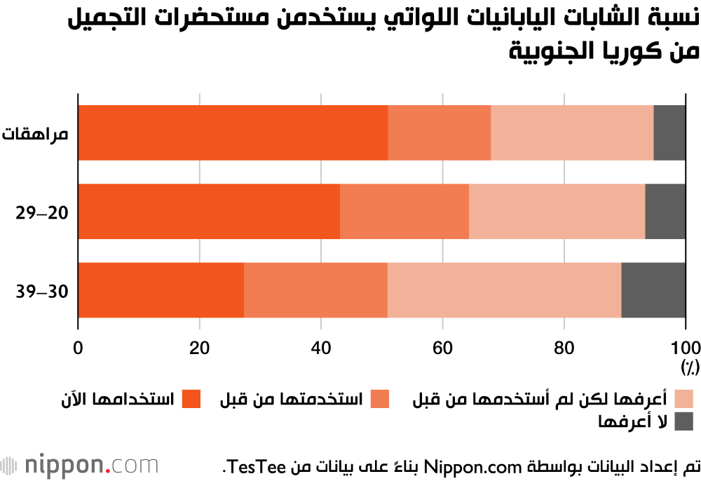 قامت شركة TesTee، وهي شركة أبحاث تسويقية تركز على الاتجاهات بين الأجيال الشابة، باستطلاع آراء 4029 امرأة تتراوح أعمارهن بين المراهقات والثلاثينيات حول مكياجهن المعتاد. عند سؤالهن ما إذا كنا يستخدمن مستحضرات تجميل كورية جنوبية، أجابت 67.9٪ في سن المراهقة، و 64.3٪ في العشرينات من العمر، و 50.9٪ في الثلاثينيات من العمر أنهن إما يستخدمنها الآن أو استخدمنها من قبل. كما قالت أكثر من نصف المراهقات إنهن يستخدمن مستحضرات تجميل من كوريا الجنوبية حاليًا.