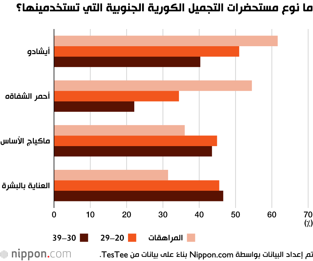 من بين أولئك اللواتي أجابن بأنهن يستخدمن مستحضرات التجميل الكورية الجنوبية حاليًا، قالت نسبة أكبر من المراهقات إنهن يستخدمن ظلال العيون ”أيشادو“ وأحمر الشفاه، مقارنة بالنساء في العشرينات إلى الثلاثينيات من العمر.