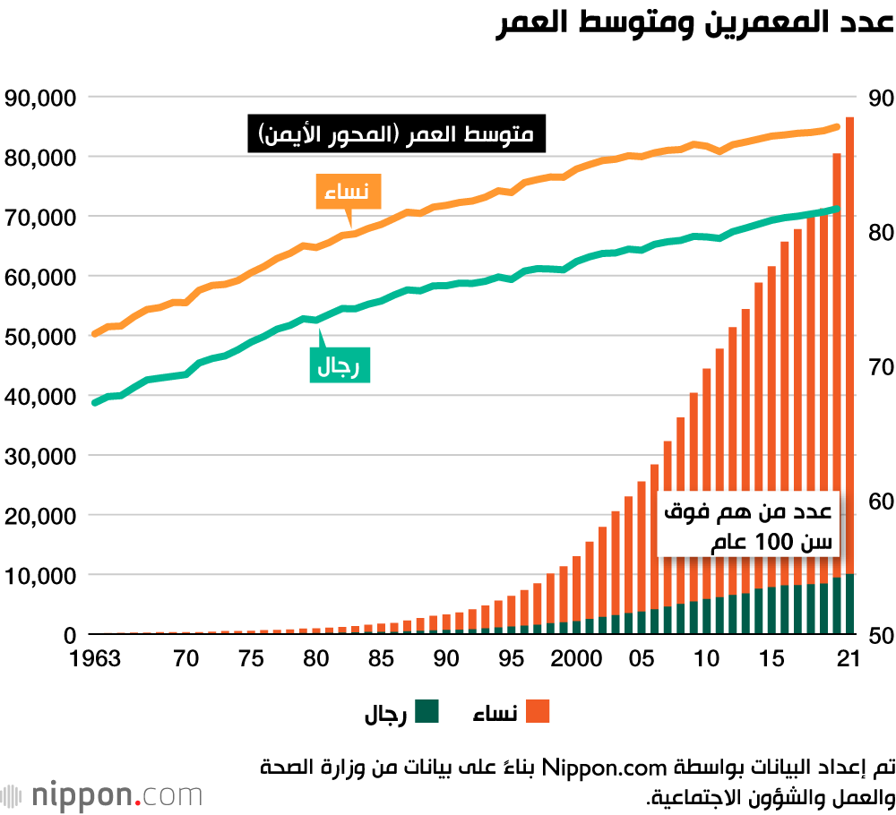 تظهر الأرقام الصادرة عن وزارة الصحة والعمل والشؤون الاجتماعية أن عدد المعمرين في اليابان (حتى 1 سبتمبر/ أيلول 2021) ارتفع بمقدار 6060 شخصًا عن العام السابق، ليصل إلى 86510 شخصًا، وهو رقم قياسي للعام الـ 51على التوالي. تتمتع اليابان بأحد أعلى معدلات طول العمر في العالم، لكن الغالبية العظمى من المعمرين، أو 88.4٪ هن من النساء.