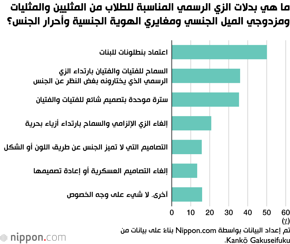 كما انتشر مفهوم ارتداء الملابس غير المرتبطة بالجنس ليشمل الزي المدرسي الياباني، الذي كان متأثرًا في الغالب بالزي العسكري الأوروبي القديم - مع بدلات البحارة للفتيات، والسترات ذات الياقات الواقية للأولاد. في الاستطلاع الوطني، وجد صانع الزي المدرسي Kankō Gakuseifuku أن 39.3٪ من المدارس قالت إنها سمحت للطلاب المثليين والمثليات ومزدوجي الميل الجنسي ومغايري الهوية الجنسية وأحرار الجنس (LGBTQ) في اختيار زيهم الرسمي. 20.3٪ قالوا إنهم يعتزمون ذلك في المستقبل. وبالتالي، فإن حوالي 60٪ من المدارس إما تسمح بالفعل بذلك أو تفكر في مثل هذه الخطوة.