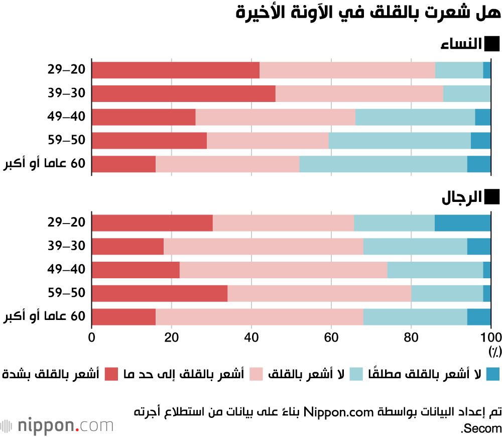 أظهر استطلاع للرأي أجرته Secom في أكتوبر/ تشرين الأول 2021 حول القلق بين اليابانيين، أن 71.8٪ من المستجيبين شعروا بدرجة من القلق بشأن شيء ما مؤخرًا. وبحسب الجنس والعمر، كانت أعلى النسب بين النساء في الثلاثينيات من العمر بنسبة 88٪ والنساء في العشرينات من العمر بنسبة 86٪. عند 52 ٪، شعرت النساء في سن 60 وما فوق بأقل درجة من القلق.