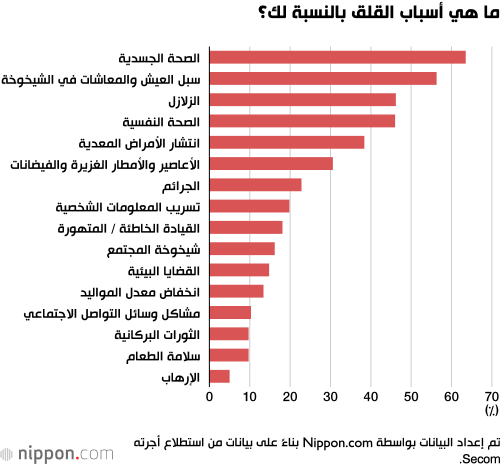 عند سؤالهم عن أسباب قلقهم مع إمكانية إعطاء إجابات متعددة، كانت الإجابة الأكثر شيوعًا هي ”الصحة البدنية“ بنسبة 63.5٪، تليها ”سبل العيش والمعاشات التقاعدية في الشيخوخة“ بنسبة 56.3٪، ثم ”الزلازل“ بنسبة 46.2٪.