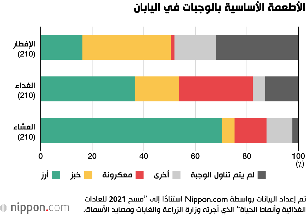 كان الخبز هو العنصر الرئيسي في وجبة الإفطار بنسبة 34.3٪، يليه الأرز و ”أخرى“ بنسبة 16.2٪ لكل منهما. بينما تخطى 31.9٪ وجبة الإفطار. بالنسبة للغداء، تناول 36.7٪ أرزًا، و28.6٪ نودلز، و17.1٪ خبزًا. كان الأرز أيضًا هو العنصر الرئيسي الأكثر شيوعًا في العشاء، بنسبة 70.5٪، يليه المعكرونة بنسبة 12.4٪، ثم ”أخرى“ بنسبة 10.0٪، والخبز بنسبة 4.8٪.