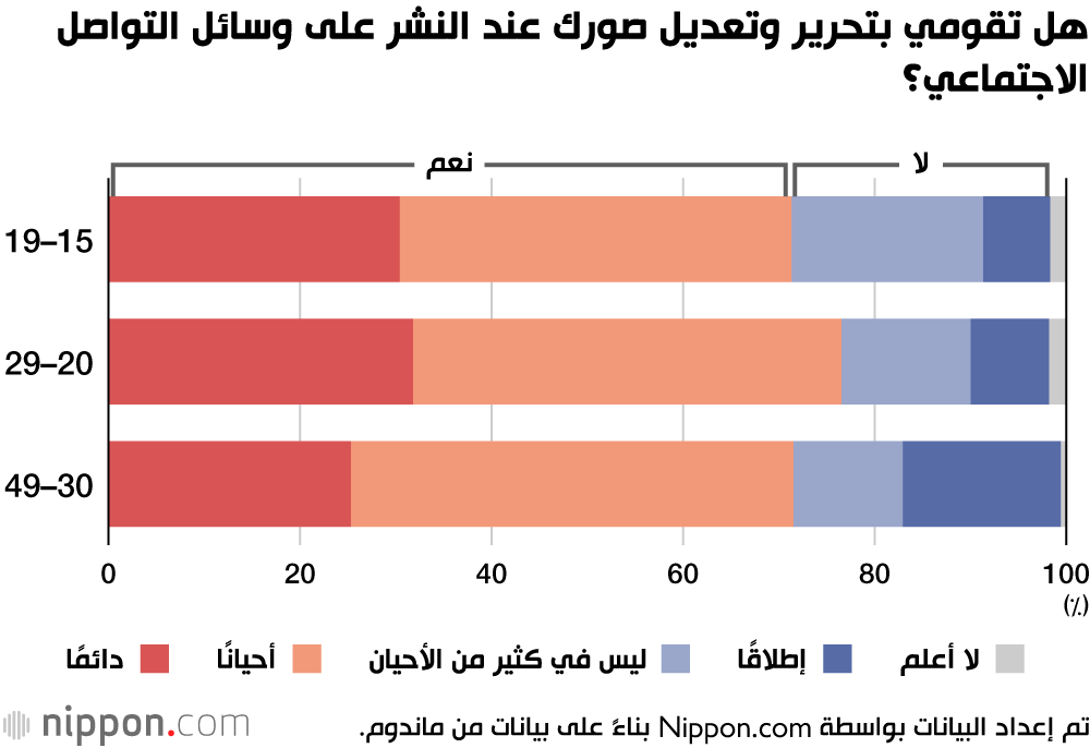 عندما أجرت شركة ماندوم اليابانية استبيانًا في مارس/ آذار 2022، وسألت 443 امرأة تتراوح أعمارهن بين 15 و49 عامًا إذا قمن بتعديل صور لأنفسهن قبل نشرها على وسائل التواصل الاجتماعي، قالت أكثر من 70٪ في المجموع في جميع الفئات العمرية إنهن إما ”دائمًا“ أو ”أحيانًا“ يفعلن ذلك. يبدو أن أقلية فقط تشارك الصور دون أي تعديل على الشبكة العنكبوتية. (الشركة التي تصنع منتجات العناية والتجميل للرجال والنساء على حد سواء، لم تسأل الرجال عن عاداتهم في تعديل الصور قبل نشرها على وسائل التواصل الاجتماعي).