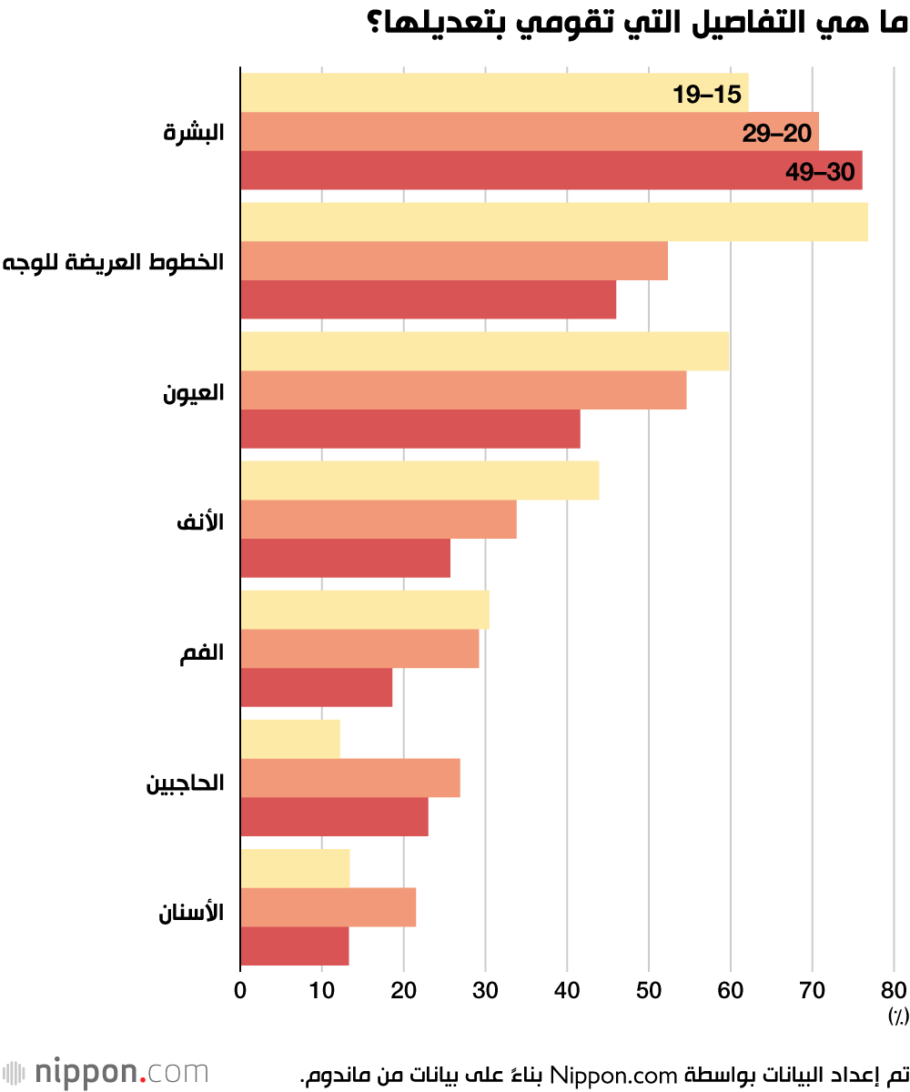 عندما سُئلن عن الميزات التي يقمن بتعديلها، أجابت 76.1٪ من النساء في الثلاثينيات والأربعينيات من العمر بـ ”البشرة“، بينما قالت 76.8٪ من المراهقات ”الخطوط العريضة“ للوجه. قامت المراهقات أيضًا بتعديل ”عيونهن“ و ”أنوفهمن“ بمعدل أعلى بكثير من أي فئة عمرية أخرى، مما يُظهر اهتمامًا وثيقًا بالتفاصيل.